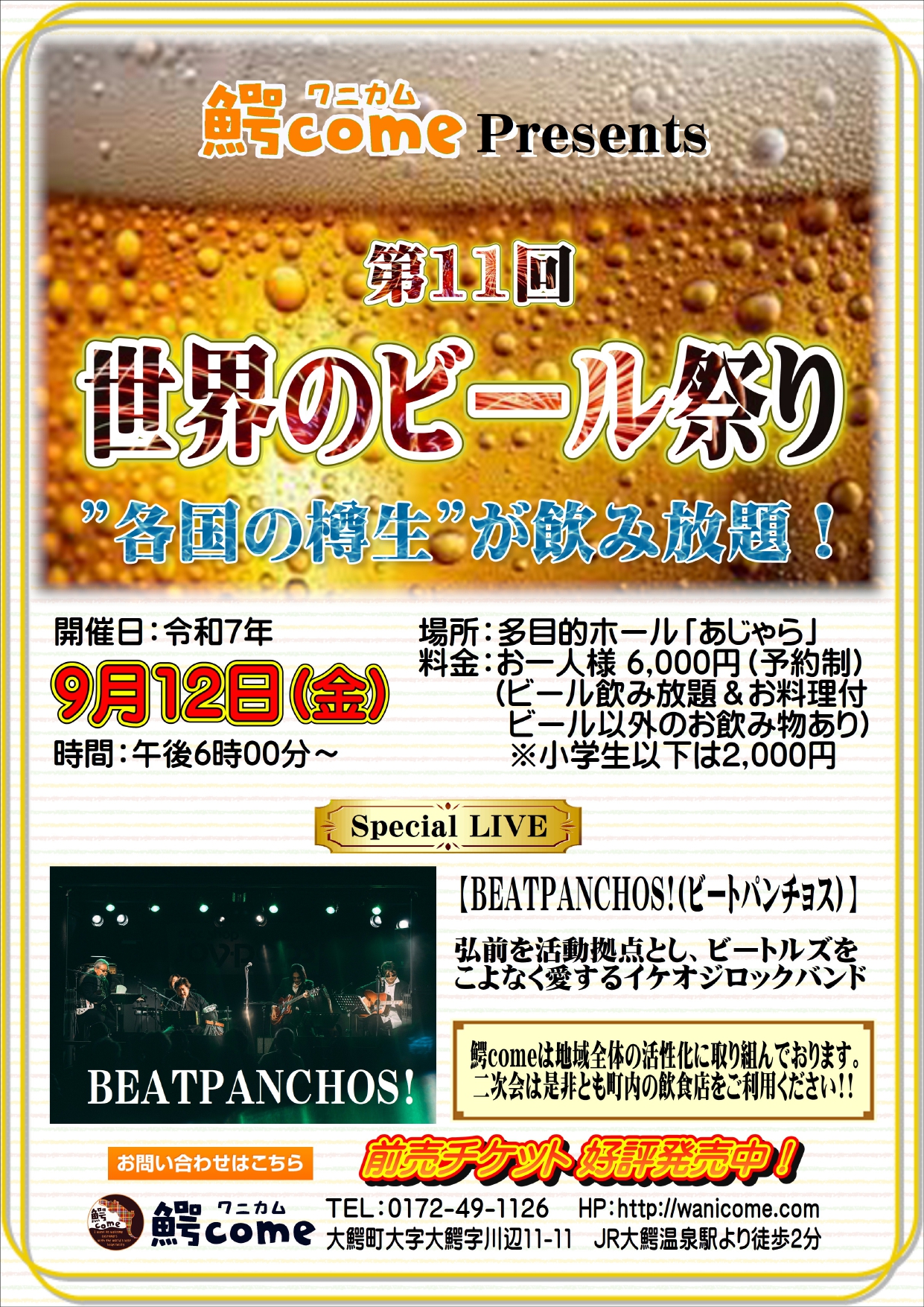 令和7年9月12日(金)、大鰐町地域交流センター 鰐comeにて「第11回世界のビール祭り」を開催いたします。