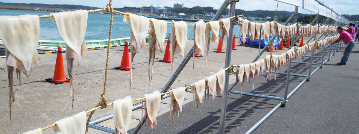 The coast in Ajigasawa is lined with grilled squid shops. The squid hung out to dry in the salty ocean breeze take on an curtain-like appearance as they flutter in the wind. The route is known as “Grilled Squid Street,” and people from inside and out of Aomori come to visit. Semi-drying intensifies the flavor, and charcoal fire-grilled squid has a rich, salty flavor and perfect juiciness.