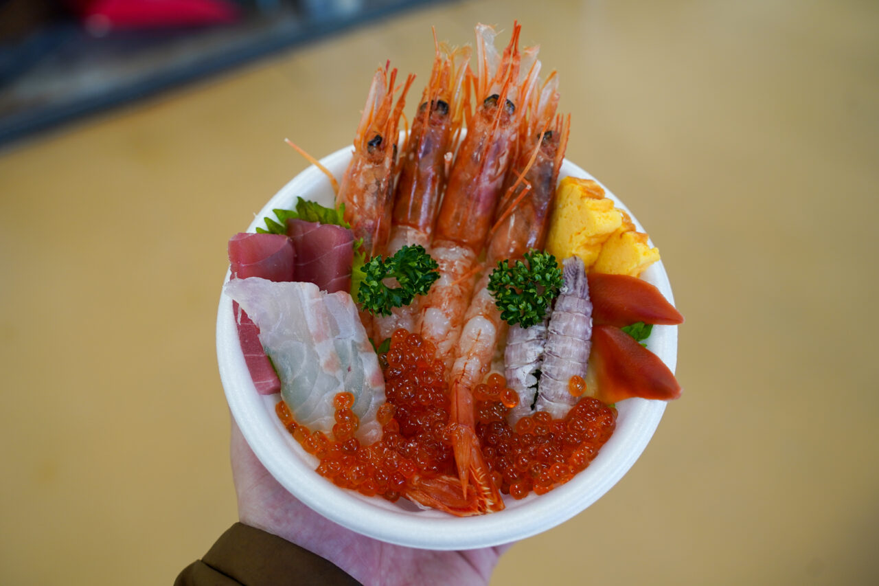 ・昼食は五所川原市の「マルコーセンター」をご案内します。新鮮な具材を自分で選べる「のへ丼」をご賞味ください。(自由昼食・各自精算)