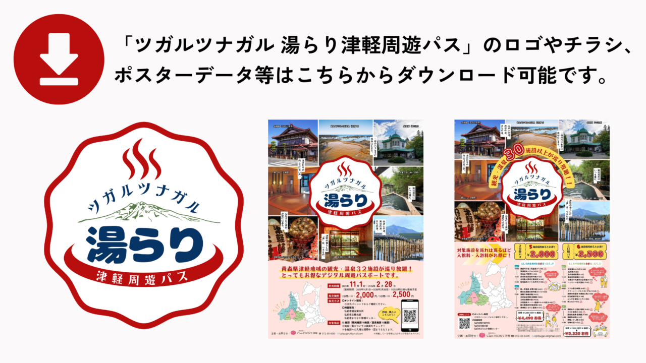 「ツガルツナガル湯らり津軽周遊パス」は、2~3日間の期間中、青森県津軽地域内32施設の温泉・観光施設に定額で入場し放題になるお得な共通チケットです。